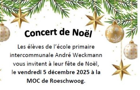 L’association des Parents d’élèves organise VENDREDI 5 DÉCEMBRE 2025 à partir de 18H son concert de Noël, avec les enfants de l’école élémentaire, à la MOC de Roeschwoog.